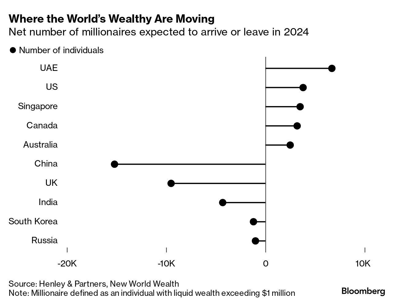 Low taxes, safer environments, and better opportunities drive the global migration of millionaires. The UAE will become the top destination for the world's wealthiest by 2024, with over 6,700 millionaires expected to relocate there. US, Singapore, and Australia are also attracting significant numbers, while traditional hubs like the UK are declining, losing around 9,500 millionaires this year alone.