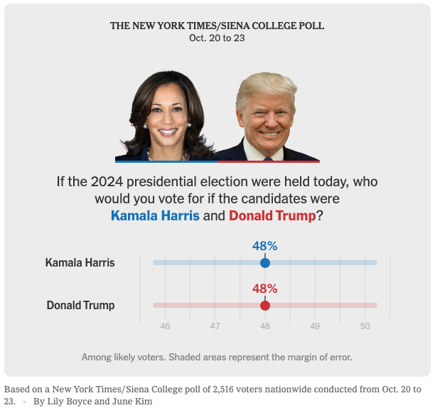 The final lap of the U.S. presidential race has come down to one thing: a deadlock. The New York Times/Siena poll shows Kamala Harris and Donald Trump tied at 48%, with the nation seemingly split down the middle. With Election Day so close and millions of votes already cast, it's a nerve-wracking scenario for both camps.
