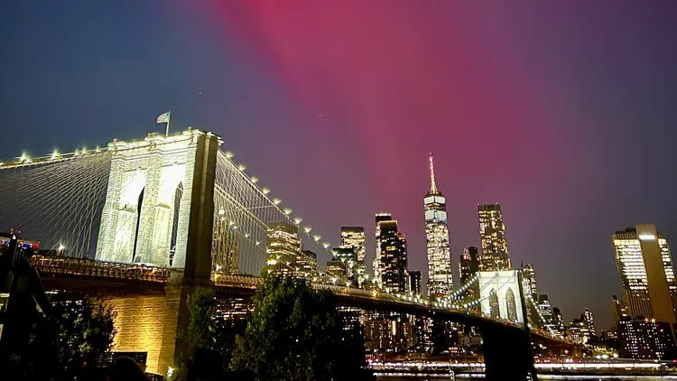 New Yorkers were in awe as the sky over the city was painted with vibrant shades of green, purple, and pink—an unexpected appearance of the Northern Lights. Intense solar storms send charged particles from the Sun to Earth, resulting in this rare sight.